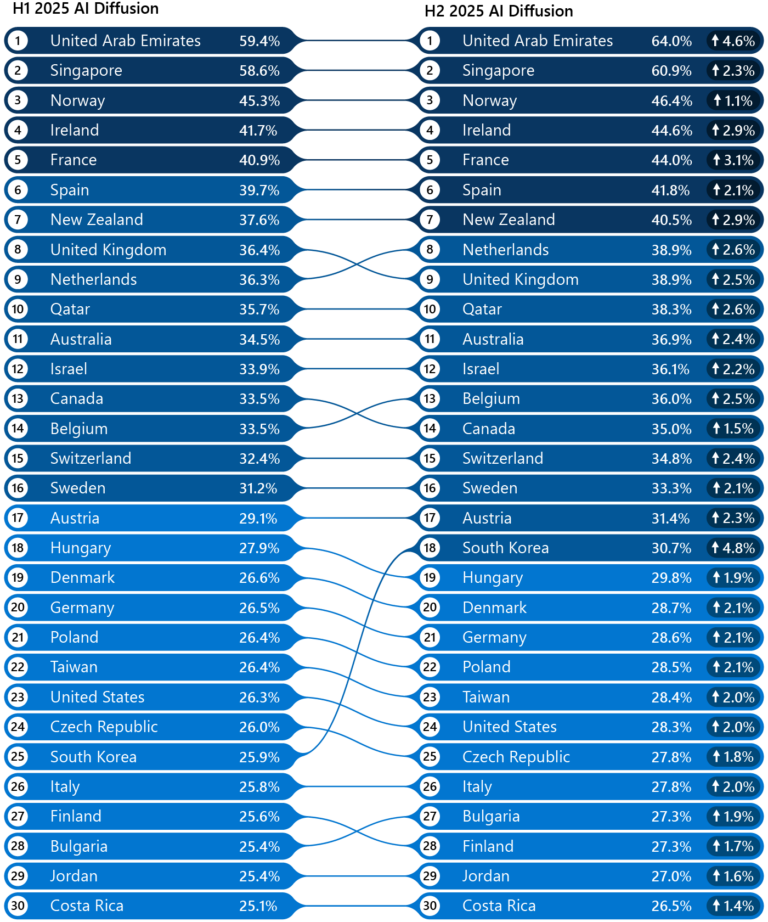Лидерами по уровню распространения ИИ остаются страны, которые рано инвестировали в цифровую инфраструктуру и государственные ИИ-программы. Первое место вновь заняли Объединенные Арабские Эмираты: к концу 2025 года ИИ используют 64% трудоспособного населения страны. За ними следуют Сингапур (60,9%), Норвегия (46,4), Ирландия (44,6%), Франция (44,0%) и Испания (41,8%). США при этом сохранили лидерство в разработке моделей и инфраструктуре, но опустились на 24-е место по доле пользователей ИИ — 28,3%.