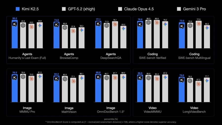 Компания утверждает, что модель демонстрирует сильные результаты в программировании, компьютерном зрении и агентных сценариях. В опубликованных бенчмарках Kimi K2.5 превзошла Gemini 3 Pro в тесте SWE-Bench Verified, а также показала лучшие результаты, чем GPT-5.2 и Gemini 3 Pro в многоязычной версии SWE-Bench.