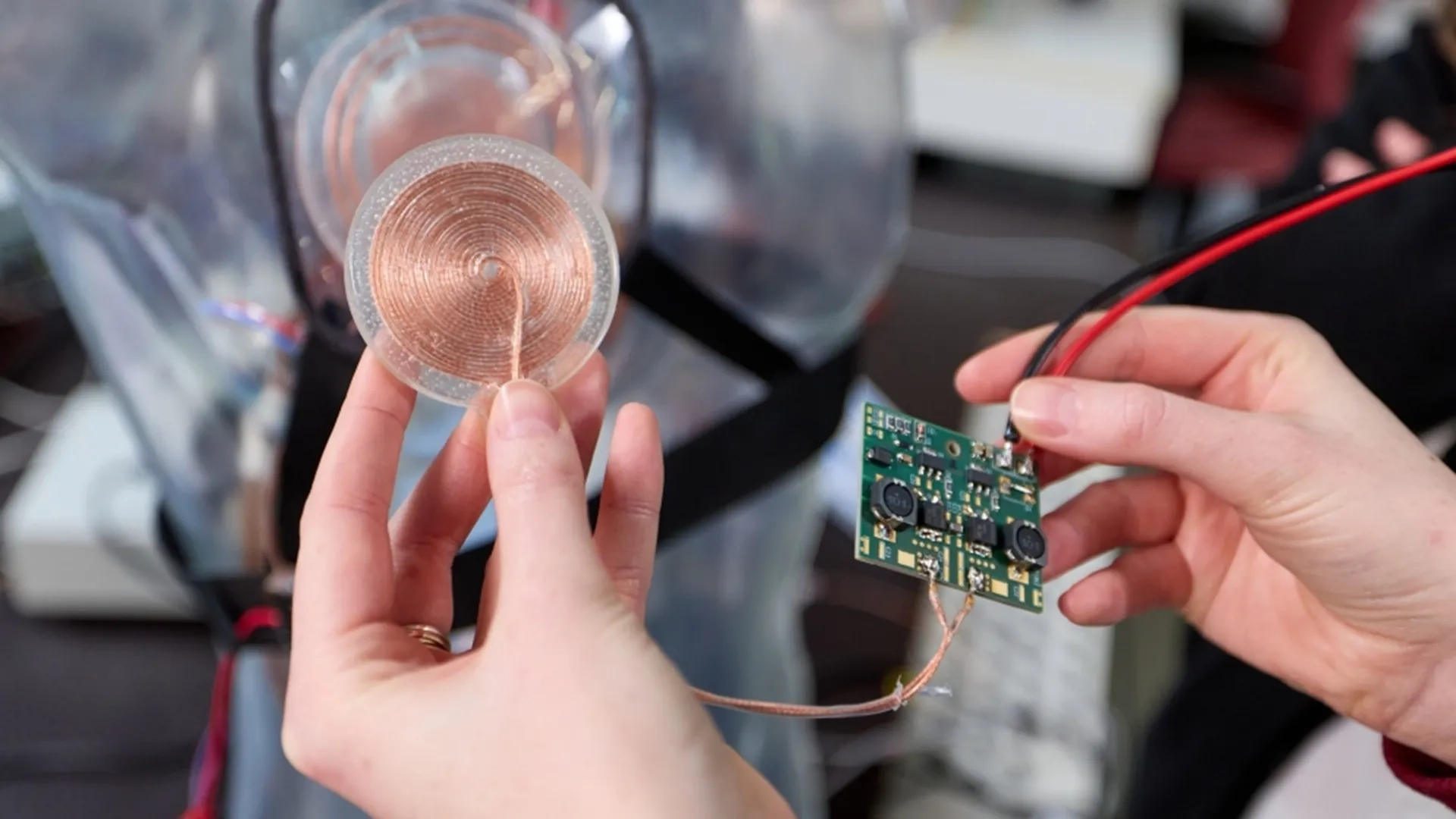 Технология, которую изучают ее коллеги, основана на переменных магнитных полях: ток в первой катушке создает магнитное поле, индуцирующее напряжение во второй катушке, что позволяет передавать электричество без разъемов и изнашивающихся кабелей. Правда, при значительных воздушных промежутках требуются дополнительная электроника и сложные алгоритмы управления.
